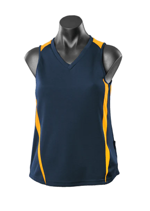 The sleek design includes a feminine V-neck with self-fabric binding and contrast color highlights, adding a touch of elegance to a practical garment. Perfect for staying cool and comfortable in any activity.
