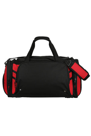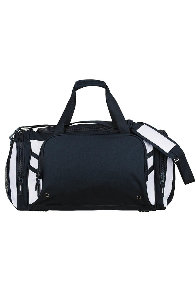 The Tasman Sportsbag is durable and versatile, perfect for gym sessions, sports activities, or weekend getaways. It is designed with functionality and features a spacious main compartment with heavy-duty zips for secure and easy access to your gear. The front zippered pocket includes an internal organizer, keeping smaller essentials neatly in place, while elasticized mesh pockets on both sides provide additional storage for water bottles or quick-access items.