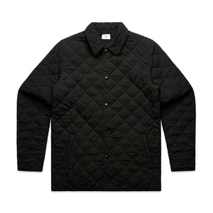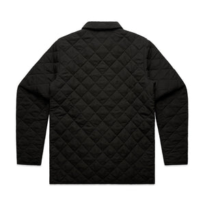 Showcasing the AS Colour Men's Quilted Jacket, featuring 100% recycled polyester wadding. Features a collared design, snap dome closure, and two side pockets. Made sustainably, saving approximately 89 recycled 500ml plastic bottles from landfills.