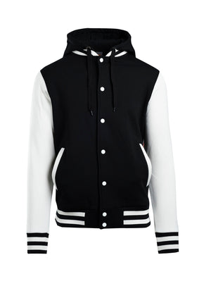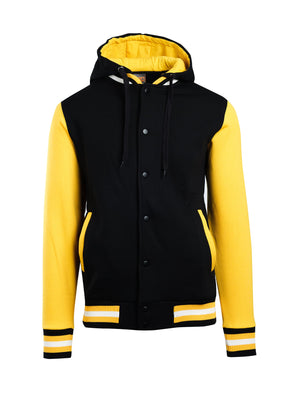 The Men's Varsity Jacket with Hood perfectly blends classic varsity style and modern functionality. Crafted from durable poly cotton brushed fleece, this jacket provides warmth and comfort for everyday wear. It features a hood for added versatility, ribbed cuffs and hem for a snug fit, and a full zip-through design for convenience.
