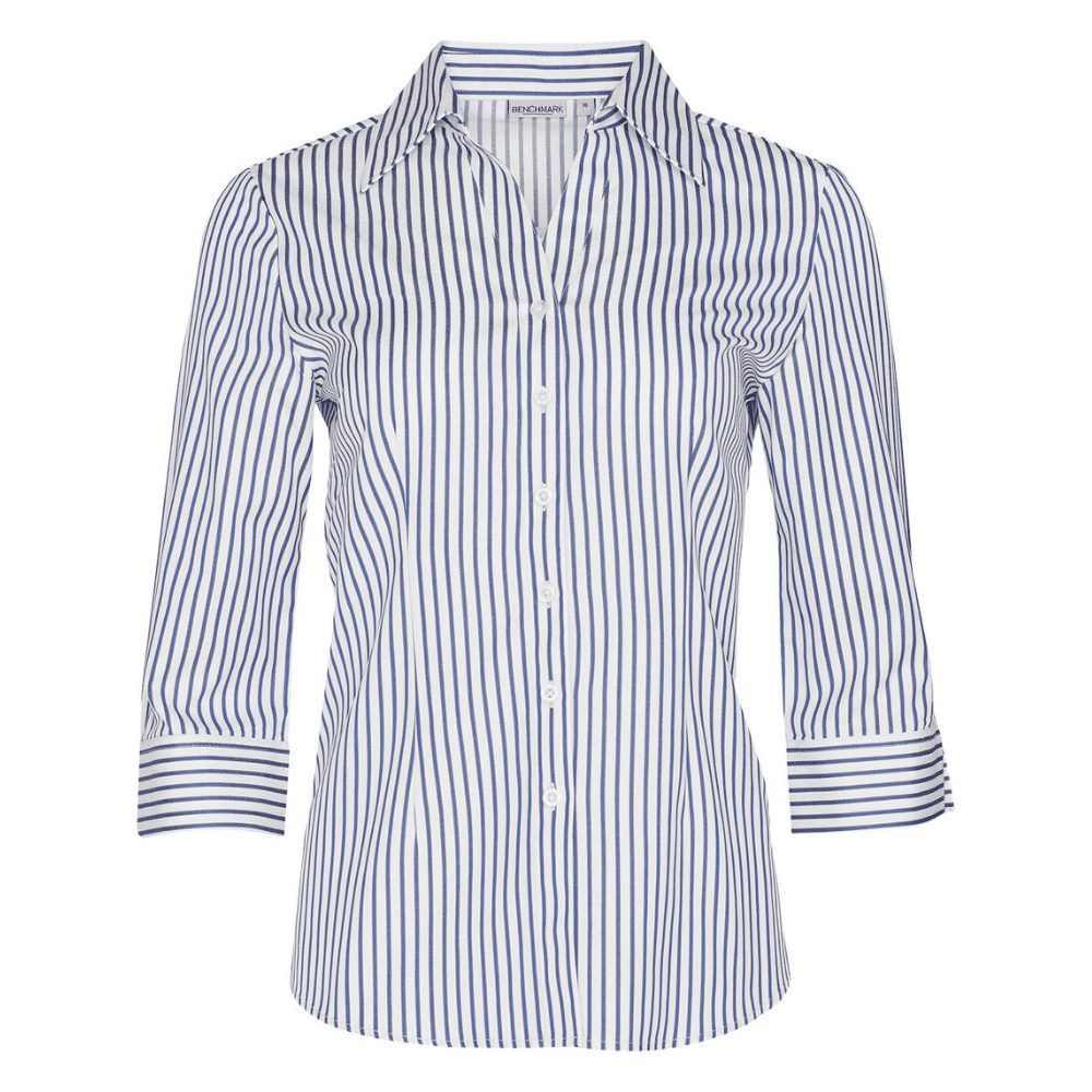 The Women's Executive Sateen Stripe 3/4 Sleeve Shirt offers a professional yet stylish look with its soft, breathable fabric. This shirt provides a polished appearance with a comfortable fit.
